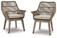 | Details | Set of 2, All-weather resin wicker furniture with aluminum frame, Nuvella® (solution-dyed polyester) high-performance fabric, All-weather foam cushion core wrapped in soft polyester, Stainless steel hardware, Designed to withstand the harsh elements of the outdoors, Wood look hand-applied paint finish, Clean fabric with mild soap and water, let air dry; for stubborn stains, use a solution of 4 oz. bleach to 28 oz. water, Imported fabric and fill, Assembly required | |