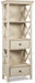 Details Made of veneers, wood and engineered wood, Textured antiqued white finish, Light distressing, 3 shelves, 2 drawers, Back panel has replicated wood veneer surface, Latticed sides, Expert assembly recommended