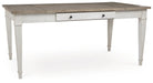 Set the scene for coastal chic or modern farmhouse living with this dining room table. Clean-lined, simply striking table doubles the charm with a brown tone top with plank effect, paired with a grayish white base with rub through effect for timeworn appeal. Multi-functional dining table features two convenient side drawers and a storage bin on each end for maximum use of space. Styled to comfortably seat six, this table makes room for one and all.