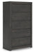 | Details | Made with engineered wood (MDF/particleboard/plywood) and decorative laminate for the right balance of affordability and durability, Dark charcoal finish over replicated oak grain, Decorative laminate replicates natural or man-made material surfaces with consistent color, pattern and texture, Recessed hand grabs create hardware-less effect, 5 smooth-gliding drawers, Drawer interiors are lined with a faux linen laminate for a clean, finished look, Safety is a top priority, clothing storage units are designed to meet the most current standard for stability, ASTM F 2057 (ASTM International), Drawers extend out to accommodate maximum access to drawer interior while maintaining safety, Assembly required | |