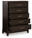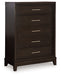 Details Made with hardwood solids, engineered wood and MDF substrates, Grayish brown wood-tone finish, Metal bar pulls with satin nickel-tone finish, 5 smooth-gliding drawers with dovetail construction and heavy duty ball-bearing side glides (top drawers felt lined)