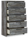 Details Made of engineered wood (MDF/particleboard) and decorative laminate, Smoky gray finish over replicated oak grain with authentic touch, Linear pulls with antiqued gunmetal finish, 5 smooth-gliding drawers, Drawer interiors are lined with a faux linen laminate for a clean, finished look, Safety is a top priority, clothing storage units are designed to meet the most current standard for stability, ASTM F 2057 (ASTM International), Drawers extend out to accommodate maximum access to drawer interior while maintaining safety
