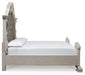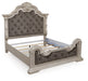 Inspired by the grandeur and grace of European traditional style, this opulent California king upholstered panel bed is nothing short of stunning. Ornate sculptural details and button-tufted fabric on the impressive headboard and footboard are sure to make a sophisticated statement in your restful retreat. A timeless antiqued white coloration lends an air of subtle elegance to this sumptuous bed.