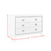 Moondance Dresser upgrades your room. This white finished double dresser features six spacious drawers. Showcases glimmering bling strip along the frame and unique black metal drawer pulls. Constructed of solid and manufactured woods for years of use. Includes ant-tipping hardware. Assembly is required.