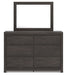 Details PCB3370B2: Includes headboard panel, headboard posts, footboard and rails, Made with engineered wood (MDF/particleboard/plywood) and decorative laminate for the right balance of affordability and durability , Dark charcoal finish over replicated oak grain, Decorative laminate replicates natural or man-made material surfaces with consistent color, pattern and texture, Foundation/box spring required, sold separately, Mattress available, sold separately, Assembly required, PCB3370B1: Includes dresser and mirror, Made with engineered wood (MDF/particleboard/plywood) and decorative laminate for the right balance of affordability and durability , Dark charcoal finish over replicated oak grain, Decorative laminate replicates natural or man-made material surfaces with consistent color, pattern and texture, Recessed hand grabs create hardware-less effect, 6 smooth-gliding drawers, Drawer interiors are lined with a faux linen laminate for a clean, finished look , Safety is a top priority, clothing storage units are designed to meet the most current standard for stability, ASTM F 2057 (ASTM International), Drawers extend out to accommodate maximum access to drawer interior while maintaining safety, Mirror attaches to back of dresser; can also be mounted on wall horizontally or vertically, Assembly required,