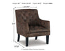 This accent chair with fashion-forward high leg silhouette gives a new meaning to traditional. Diamond button tufting garnishes the back and the plump seat. Distressed fabric with the look of quality leather adds a classic touch that you can appreciate. Mahogany brown color makes it all the more timeless.