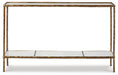 Classic in design with a dash of textural appeal, this console table provides both flair and function. Ideal to rest behind a couch or in an entryway, its glass tabletop and white marble lower shelf offer the perfect perch for decorative pieces. The frame's antiqued brass-tone finish has a rustically luxe look that remains versatile, suiting spaces from casual to contemporary.