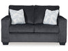 If style is the question, then this loveseat is the answer. Sporting clean lines and sleek track arms, the decidedly contemporary profile is enhanced with plump cushioning and a chenille-feel upholstery that's so pleasing to the touch. Sure to play well with so many color schemes, this loveseat in slate gray includes a pair of understated floral pattern pillows for fashionably fresh appeal.
