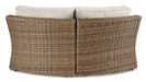 | Details | All-weather resin wicker handwoven over powder coated rust-proof aluminum frame, Zippered cushions covered in high-performing Nuvella™ fabric, 2 throw pillows included, All-weather foam cushion core wrapped in soft polyester, Clean fabric with mild soap and water, let air dry; for stubborn stains, use a solution of 4 oz. bleach to 28 oz. water, Imported fabric and fill, Assembly required | |