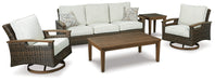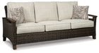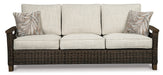 Pretty enough for trendy interiors, yet durable enough to weather the elements, the Paradise Trail outdoor sofa rises to the challenge beautifully. Handwoven resin wicker over rust-proof aluminum merges high style with low maintenance. Rest assured, though the exposed armrests and feet look remarkably like wood, their sturdy aluminum construction is perfectly suited for alfresco living. Plush seat cushions and throw pillows wrapped in high-performing Nuvella® fabric aim to please.