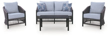 Details Includes loveseat, 2 lounge chairs and coffee table, Rust-resistant aluminum frame with durable powder coated finish, Powder coated aluminum resists rusting and fading, Polyester rope, Foam cushion core wrapped in soft polyester for a low-maintenance, comfortable cushion, Solution-dyed high-performance fabric, Nuvella® is an outdoor fabric that can be cleaned and offers enhanced UV resistance, Clean fabric with mild soap and water, let air dry; for stubborn stains, use a solution of 4 oz. bleach to 28 oz. water, Stainless steel hardware resists rust and boosts longevity, Designed to withstand the harsh elements of the outdoors, 2 throw pillows included, Assembly required