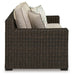 Who says the great outdoors isn’t made for luxury living? This loveseat with cushion offers all the high-end design, plush comfort and durability you could ask for, and then some. Its all-weather, rust-proof aluminum frame provides the easy-breezy wicker look you love without the high maintenance. Rest assured, the high-performing Nuvella® fabric covering the cushions and throw pillows is made to stand up to the elements.