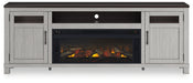 Details Includes TV stand and electric fireplace insert, Made with solid acacia wood, cherry veneer and MDF substrates, Glazed light gray painted finish with brown cherry-stained shelves and top, Metal pulls with aged iron-tone finish, Subtle handmade distressing marks for added character and charm, 2 cabinets (each with an adjustable shelf) and single open cubby, Electric fireplace insert provides up to 5,386 BTU/1,500W and warms up to 1,000 square feet; 6-level temperature setting; overheating control device, 5 levels of flame brightness; LED-lit flame operates with or without infrared heat, Realistic-looking log set with dynamic glowing embers; ambient down light with on/off function, Built-in audio speakers with wireless connectivity; touch button controls and remote control, Timer function with programmable ranges from 10 minutes to 9 hours, Power cord included; UL Listed, Assembly required; simply remove the center shelf and back panel to make room for the fireplace insert