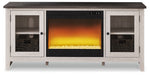 Details Includes TV and electric fireplace insert (W100-02), Made of decorative laminate and engineered wood, Two-tone finish (replicated gray wood top and antique white base), Pair of glass inset doors, Adjustable center shelf; 2 side shelves and cutouts for wire management, Electric fireplace insert provides up to 4,608 BTU/1,400W and warms up to 400 square feet (heats a mid-size room) , 6-level temperature setting; 5 levels of flame brightness, LED-lit flame operates with or without heat, Option for placing faux glass crystals or stones (included), Overheating control device, Remote control with LED display, Power cord included; UL Listed, Assembly required; simply remove the center shelf and back panel to make room for the fireplace insert