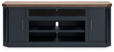 This TV stand combines casual contemporary design with modern appeal. Its combination of a thick-bodied wood-tone top with a slate blue cabinet is a smart choice on so many levels. Stow away electronics in the roomy cabinets, and use the upper shelf to conceal a soundbar speaker for a clean integrated look. Enhancing the experience: the optional fireplace insert (sold separately) brings a touch of warmth and beautiful ambiance to your living room.