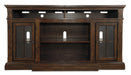 Details Includes TV stand and electric fireplace insert (W100-121), Made of veneers, wood, engineered wood and marble, 2 storage cubbies; 2 cabinets with tempered glass doors and 1 adjustable shelf, each, Breakfront moulding with natural marble inset, Cutouts for wire management, Electric fireplace insert provides up to 5,386 BTU/1,500W and warms up to 1,000 square feet (heats larger rooms), 7-level temperature setting; 5 levels of flame brightness; overheating control device, LED-lit multi flame display operates with or without infrared heat, Realistic-looking log set with dynamic glowing embers, Remote control with LED display, Timer function with programmable ranges from 10 minutes to 9 hours, Power cord included; UL Listed, Assembly required; simply remove the center shelf and back panel to make room for the fireplace insert
