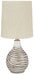 Shine a contemporary spotlight on your good taste with this table lamp. The antiqued white and goldtone finish of its base adds texture and interest to any space. With a modified drum shade, this light will illuminate your decor with style.