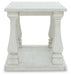 Details Made with hardwood solids, elm veneer, MDF substrates and cast resin, Antiqued white finish, 4 cast resin baluster legs, Open lower shelf, Assembly required