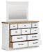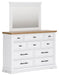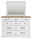 Details Includes dresser and mirror, Made with hardwood solids, MDF substrates and butcher block oak veneer, Dresser with 2-tone finish (white finish; butcher block oak veneer with natural finish), Pulls with matte black finish, 10 spacious drawers with fully finished interiors (top drawers felt lined), dovetail construction and ball-bearing side glides , Drawers with inset picture fronts, Mirror attaches to back of dresser