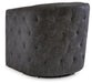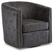 Details Barrel back and loose seat cushion, Upholstered in distressed black faux leather, Foam cushions wrapped in thick poly fiber, Tufted sides, Antiqued brass-tone nailhead detail, Metal swivel base