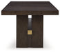 Dressed to thrill, this simply stunning dining table offers a high-design look at a down-to-earth price. Ultra sleek lines are accentuated with a dark waxy brown oak-tone finish that’s so easy on the eyes. Clean-lined and modern, the double pedestal base and thick edge tabletop showcase quality craftsmanship and attention to detail. Whether you're hosting family meals or holiday entertaining, it has a timeless look that’s made to last.