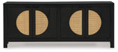 Bring high style and functionality to your home with this contemporary accent cabinet. Woven cane door fronts and a contrasting black finish bring the wow factor to this mid-century inspired piece. Whether it suits your storage needs in the dining room, home office or entryway, it's quite a showpiece.