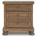 A relaxed take on casual traditional design, this nightstand strikes a comfy pose with a classic sensibility. Its timeless design and chestnut brown wood tone create a welcoming retreat tailored to your laid-back lifestyle. Metal knobs in an aged pewter color subtly dress up framed inset drawers that store nighttime essentials. A hidden pull-out tray behind the bottom drawer keeps your small valuables out of sight.