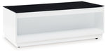 Details Made with MDF substrates, High-gloss white finish, Black glass tabletop; black acrylic laminate drawer fronts, 2 smooth-gliding drawers, Open display shelf, Casters for easy mobility