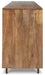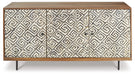 | Details | Made of wood and engineered wood, Natural, black and ivory finishes, 3 doors with geometric carving and black metal knobs, 3 shelves, Cutouts for wire management, Assembly required | |