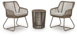 Details Includes table and 2 chairs, Made with aluminum frame and polyester rope, Chair with reinforced steel legs, Cushions with solution-dyed high-performance fabric, Nuvella® is an outdoor fabric that can be cleaned and offers UV resistance, All-weather foam cushion core wrapped in soft polyester, Clean fabric with mild soap and water, let air dry; for stubborn stains, use a solution of 4 oz. bleach to 28 oz. water, Stainless steel hardware resists rust and boosts longevity, Designed to withstand the harsh elements of the outdoors, Assembly required
