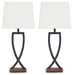 This table lamp is an enticing merger of mixed materials. Textured black finished metal stands poised atop a block of warm brown wood. And the lamp's open design is right at home among casual decor.