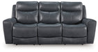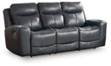 Prepare to be moved. This power reclining sofa combines sleek modern design with all the soothing features you've been dreaming of. Wrapped in blue-hued leather and faux leather for affordable luxury, this highly contemporary piece with cozy scoop seating suits your relaxed vibe. Infinite reclining and headrest positions are yours at the touch of a button. It's the perfect choice for anyone who wants their comfort with a side of style.