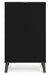 The perfect marriage of simple and contemporary style, this chest of drawers is a charming addition to your home. It features an expressive two-tone look, with a dark charcoal finish over replicated oak grain with an authentic touch and a replicated sugarberry wood grain. Ball-bearing glides offer smooth opening and closing of the drawers, while matte black knobs and splay legs add a finishing touch.