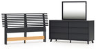 Details B1013-157: Made with engineered wood (MDF/particleboard/plywood) and decorative laminate for the right balance of affordability and durability, Matte black finish with subtle replicated wood grain, Decorative laminate replicates natural or man-made material surfaces with consistent color, pattern and texture, ¼" bolts (not included) are needed to attach headboard to your existing bed frame, Minor assembly required, B1013B11: Includes dresser and mirror, Made with engineered wood (MDF/particleboard/plywood) and decorative laminate for the right balance of affordability and durability, Matte black finish with subtle replicated wood grain, Decorative laminate replicates natural or man-made material surfaces with consistent color, pattern and texture, 6 smooth-gliding drawers, Drawer interiors are lined with a faux linen laminate for a clean, finished look, Integrated drawer pulls, Framed front and pilasters, Mirror attaches to back of dresser; can also be mounted on wall horizontally or vertically, Safety is a top priority, clothing storage units are designed to meet the most current standard for stability, ASTM F 2057 (ASTM International), Drawers extend out to accommodate maximum access to drawer interior while maintaining safety, Minor assembly required,