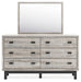 Details B1036-57: Made with engineered wood (MDF/particleboard/plywood) and decorative laminate for the right balance of affordability and durability, Light gray finish over a replicated oak grain with authentic touch, Decorative laminate replicates natural or man-made material surfaces with consistent color, pattern and texture, ¼" bolts (not included) are needed to attach headboard to your existing bed frame, Capable of attaching to a full-sized metal bolt-on bed frame, Assembly required, B1036B1: Includes dresser and mirror, Made with engineered wood (MDF/particleboard/plywood) and decorative laminate for the right balance of affordability and durability, Light gray finish over a replicated oak grain with authentic touch; base has matte black finish with subtle replicated wood grain, Decorative laminate replicates natural or man-made material surfaces with consistent color, pattern and texture, Handles with matte black finish, 6 smooth-gliding drawers, Drawer interiors are lined with a faux linen laminate for a clean, finished look, Mirror attaches to back of dresser; can also be hung horizontally or vertically, Safety is a top priority, clothing storage units are designed to meet the most current standard for stability, ASTM F 2057 (ASTM International), Drawers extend out to accommodate maximum access to drawer interior while maintaining safety, Assembly required,