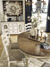 Details Made with wood and engineered wood, Distressed, chipped white finish, Ladderback styling, Polyester upholstery over foam cushioned seat, Assembly required