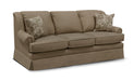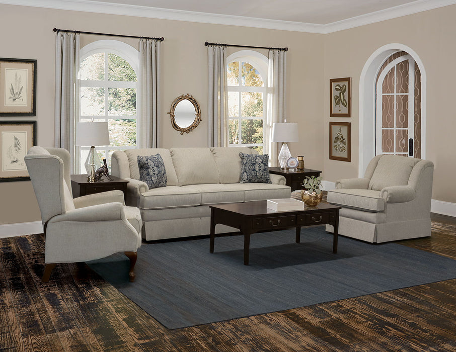 The upscale simplicity of the Rochelle collection is unsurpassed. Its petite scale, traditional skirt, and contrasting throw pillows make it just about perfect. This collection features a sofa, stationary and gliding loveseats, stationary and swivel gliding chairs, ottoman, and queen sleeper.