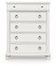 Details Made with hardwood solids, veneers and MDF substrates, Rubbed antiqued white finish, Metal hardware with pewter-tone finish, 5 smooth-gliding drawers with fully finished interiors, French/English dovetail construction and heavy-duty ball-bearing side glides, Top drawer felt lined