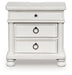 Taking a laid-back approach to casual traditional design, this artfully crafted nightstand combines classic elements with a clean modern approach. Its rubbed antiqued white finish exudes a comfy, timeless appeal that's sure to carry you away to a dreamy time and place. The simple round metal knob and ring pulls on the nightstand's spacious drawers make just the right statement, while an integrated power outlet and USB charging keep your devices powered up overnight.