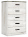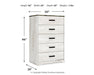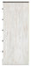 | Details | Made with engineered wood (MDF/particleboard/plywood) and decorative laminate for the right balance of affordability and durability, Whitewash replicated worn through paint, Top with rustic gray planked replicated oak grain with authentic touch, Pewter-tone pulls, 5 smooth-gliding drawers with vinyl-wrapped sides and back, Safety is a top priority, clothing storage units are designed to meet the most current standard for stability, ASTM F 2057 (ASTM International), Drawers extend out to accommodate maximum access to drawer interior while maintaining safety, Assembly required | |