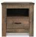 Details Made of engineered wood (MDF/particleboard) and decorative laminate, Warm rustic plank finish over replicated oak grain with authentic touch, Antiqued bronze-tone hardware, 1 storage cubby, 1 smooth-operating drawer, Nailhead accents, 2 slim-profile USB charging stations, Power cord included; UL Listed, Assembly required