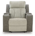 Refined relaxation, reimagined for the modern home. This power recliner combines premium comfort with smart features like built-in storage arms, USB charging and cup holders. One-touch reclining and an adjustable headrest let you find your perfect position, while luxurious heat and massage functions melt away the day's stress. And for an added dose of style, it's wrapped in a two-tone upholstery that pairs soft textured fabric with coordinating faux leather.